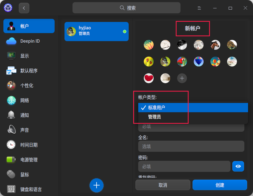 我的系统是Deepin,新建帐户的时候是可以选择帐户类型的。标准用户是没有管理权限的,不能新建用户。