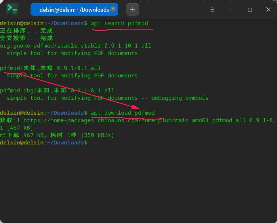 第三步:在终端中输入apt download pdfmod下载这个应用