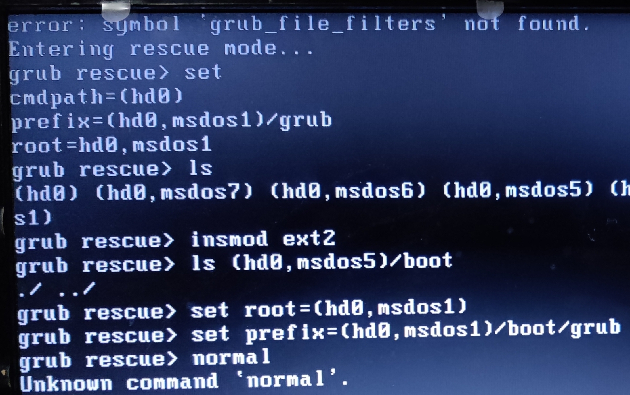 grub rescue>set prefix=(hd0,msdos1)/boot/grub