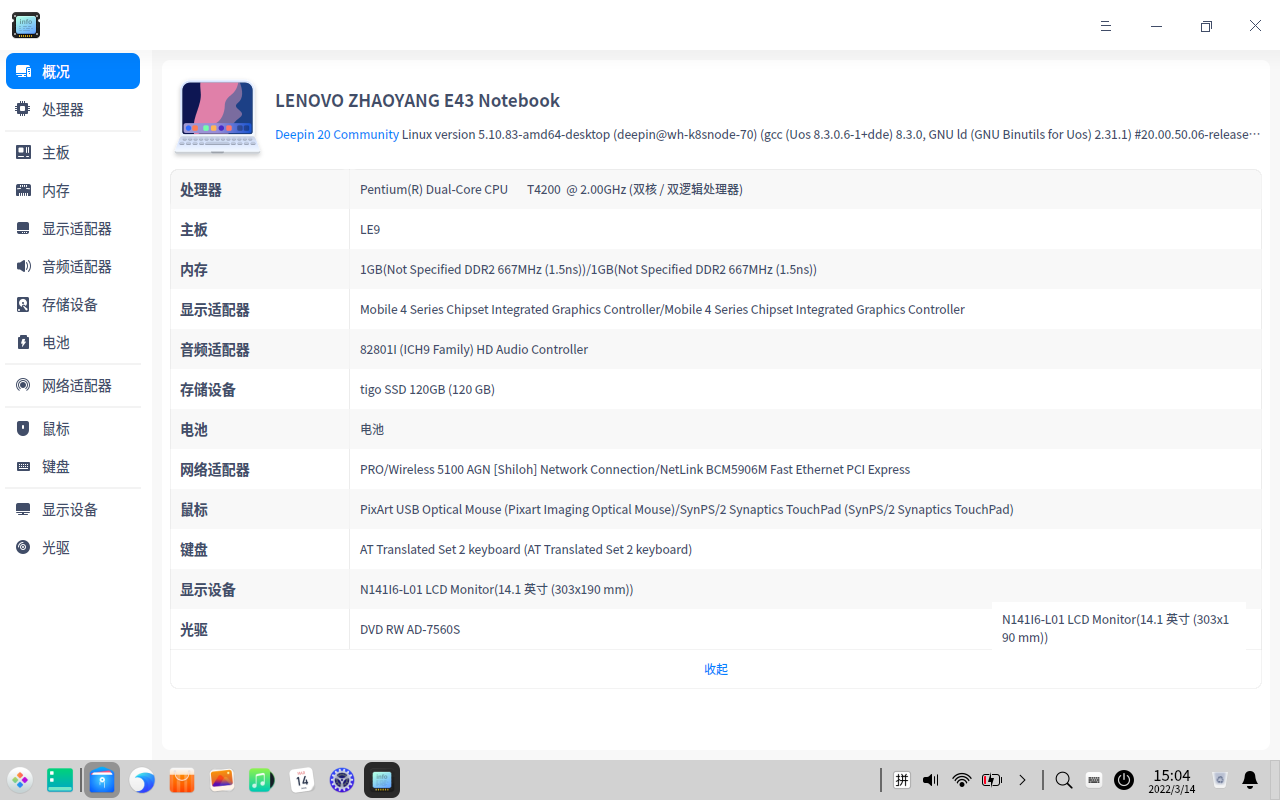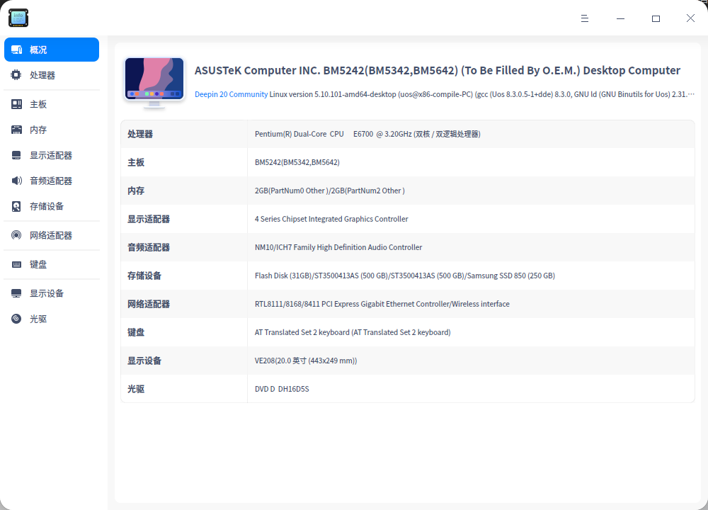 使用旧电脑安装最新deepin20.4版本,安装完成后打开系统“设备管理器”应用后截图(“概况”界面,展示电脑基础的硬件信息),将截图在本帖下回复。
