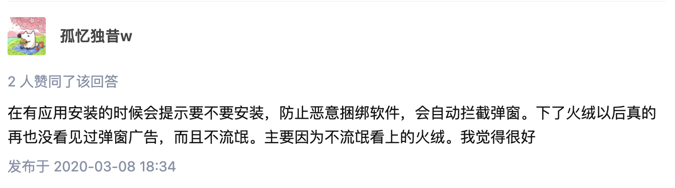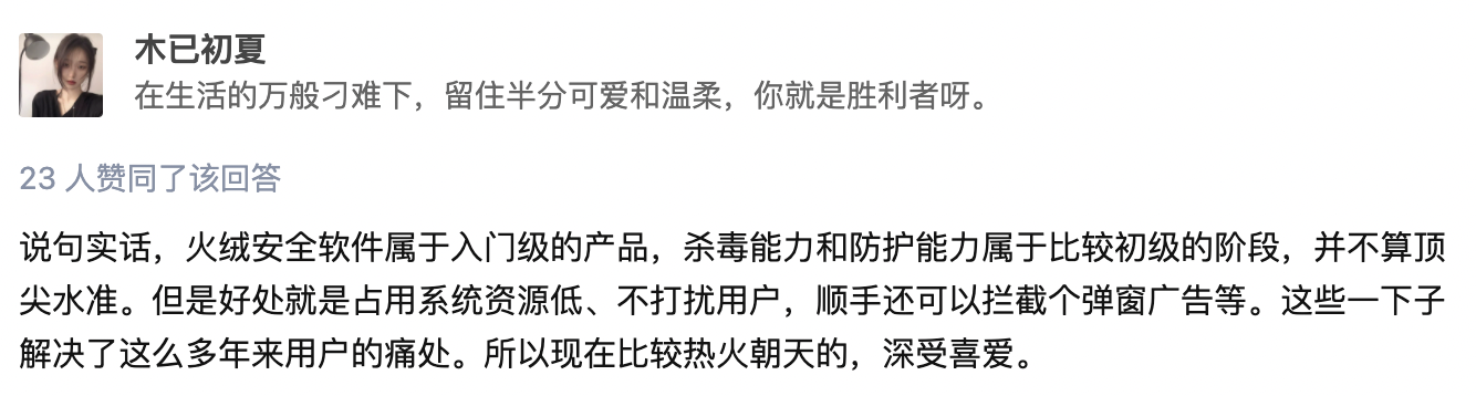 火绒的主要特点在于占用系统资源低、不打扰用户、没有弹窗广告。我们来看看某平台用户对火绒的评价: