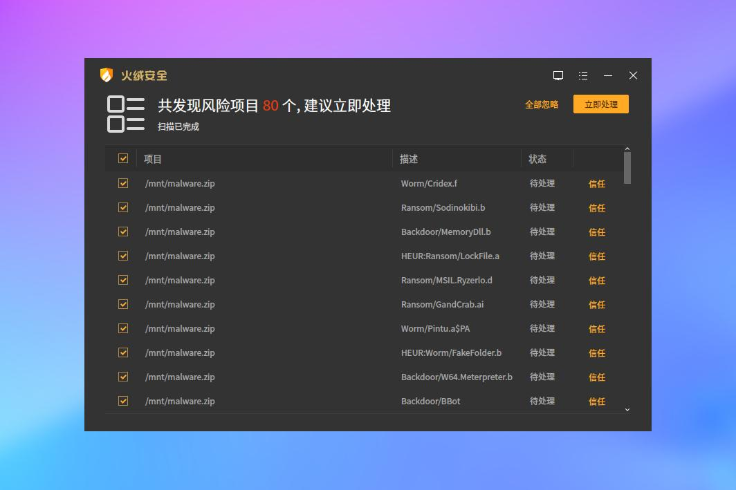 火绒终端安全管理系统秉承“情报驱动安全”新理念,是全面实施EDR运营体系的新一代反病毒&终端安全管理软件,能充分满足用户在目前互联网威胁环境下的电脑终端防护需求。在保护用户安全的同时,截获、处理各种未知威胁。