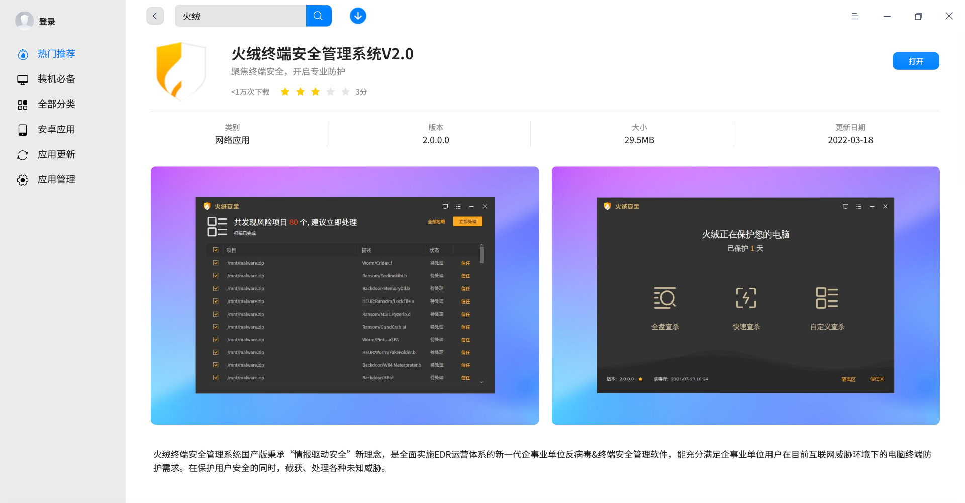 打开深度应用商店,搜索关键词“火绒”就可以安装使用啦!