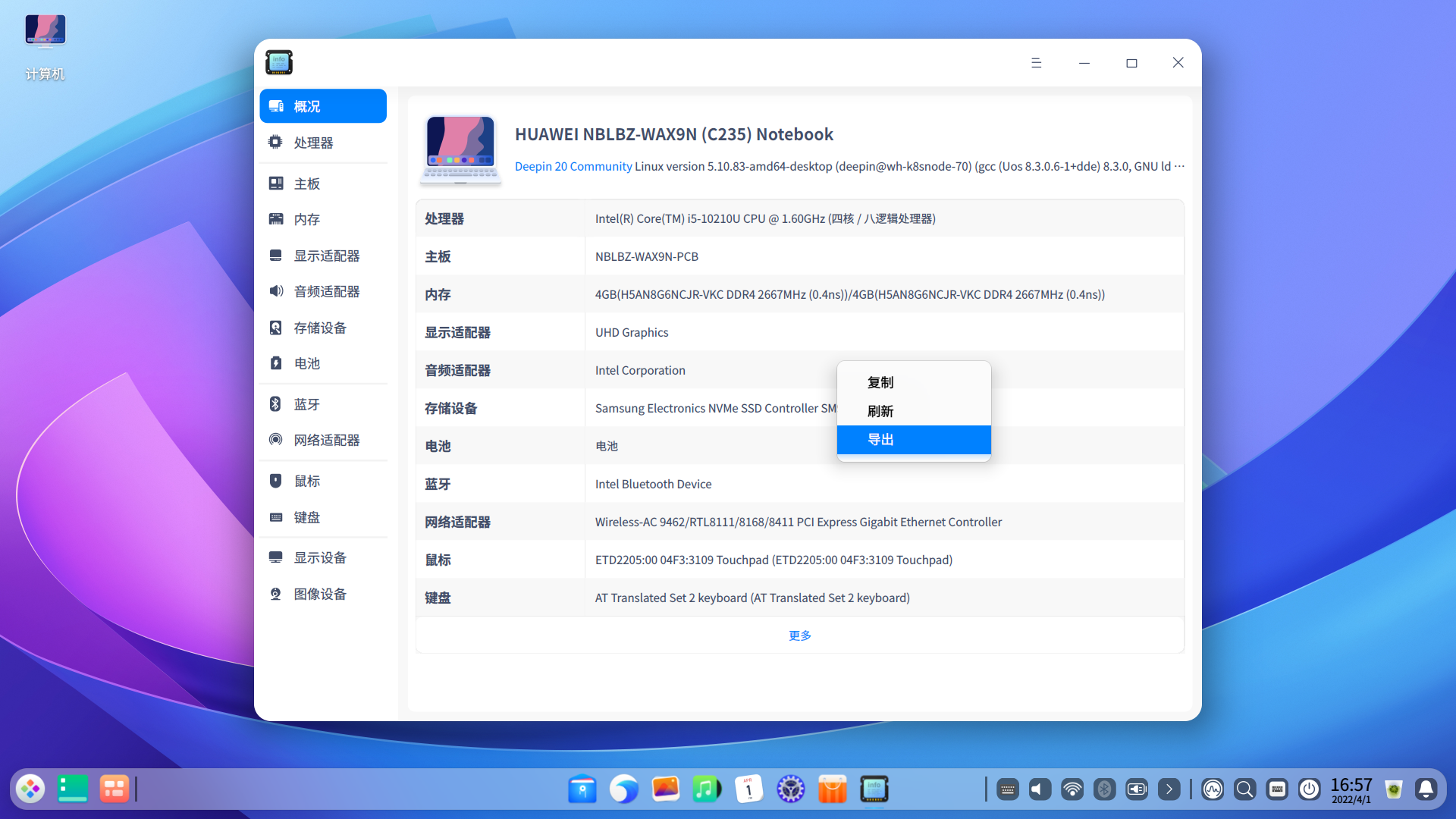 1、打开设备管理器应用,在“概况”界面鼠标右键,选择[导出],保存设备信息txt文件。