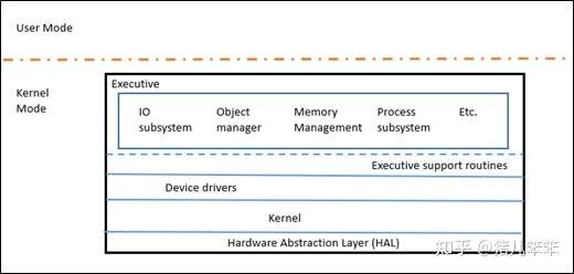 翻译一下:Windows NT有点像微内核,因为它里面的Core Kernel(简称KE)只是负责很少的工作,其它的事呢都交给执行层(简称Ex)来完成。要强调一下,因为Ex是在Kernel Mode下运行的,所以Windows NT不是一个真正的微内核。