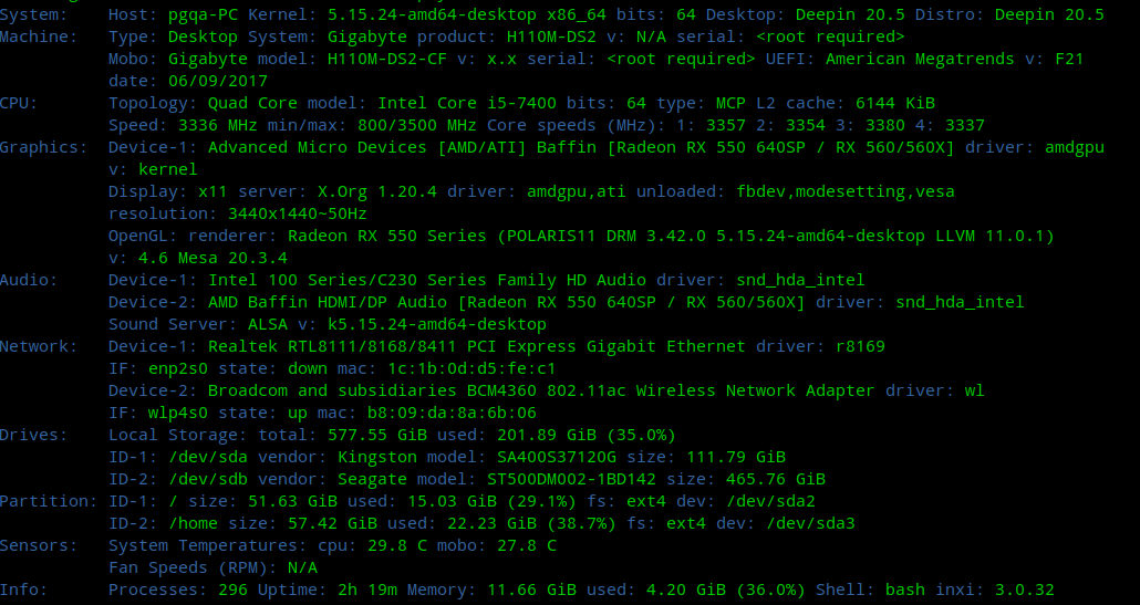 System: Host: shenmo-PC Kernel: 5.15.24-amd64-desktop x86_64 bits: 64 Desktop: Deepin 20.5 Distro: Deepin 20.5
