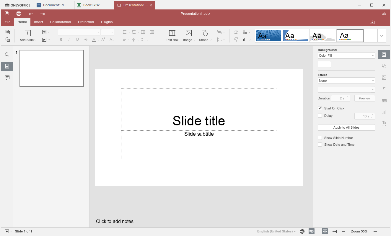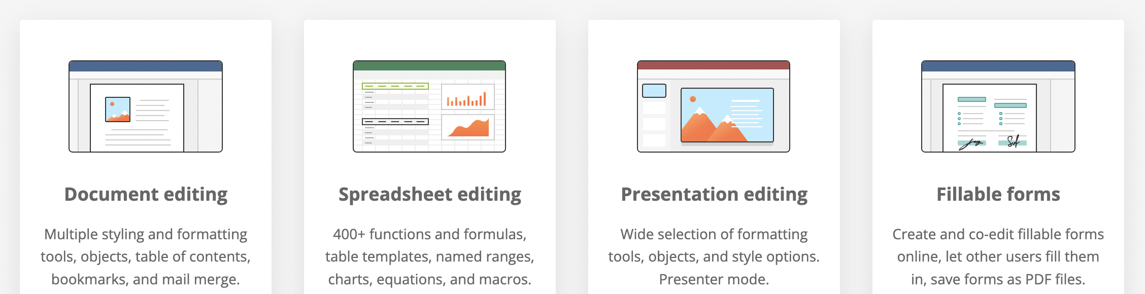 支持创建、查看和编辑任意大小和复杂程度的文件。兼容多种常见格式的文档:DOCX、ODT、XLSX、ODS、CSV、PPTX、ODP等等,通过基于选项卡的用户界面,可以在同一个窗口中处理多个文件。