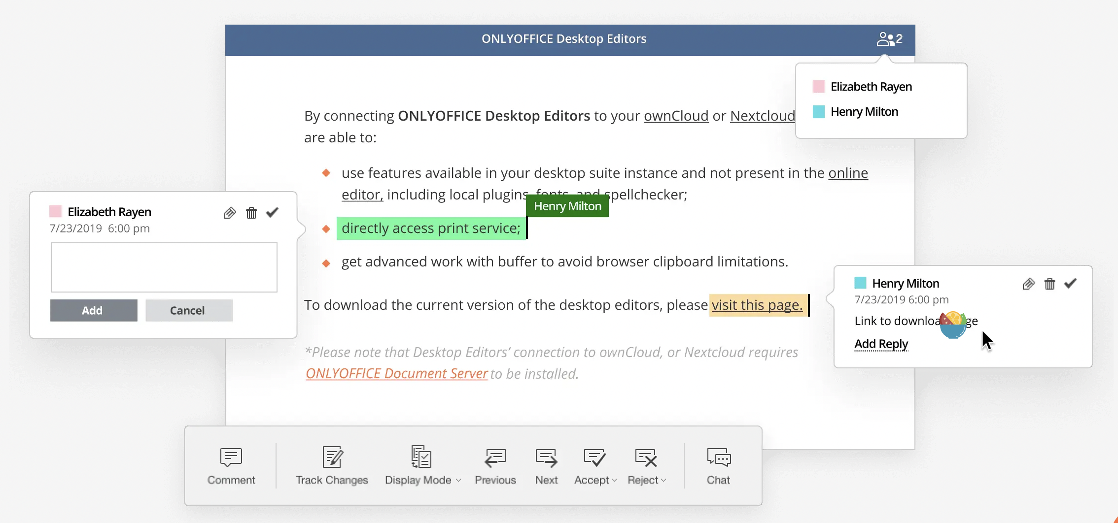将ONLYOFFICE连接到选择的云平台中(可使用ONLYOFFICE、Nextcloud、ownCloud、Seafile、Liferay 或kDrive),与团队协作处理文档,实时共同编辑、审阅、批注和聊天互动。