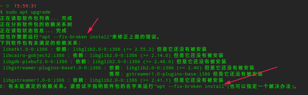 终端输入:sudo apt-get update&&sudo apt-get dist-upgrade,按提示修复依赖