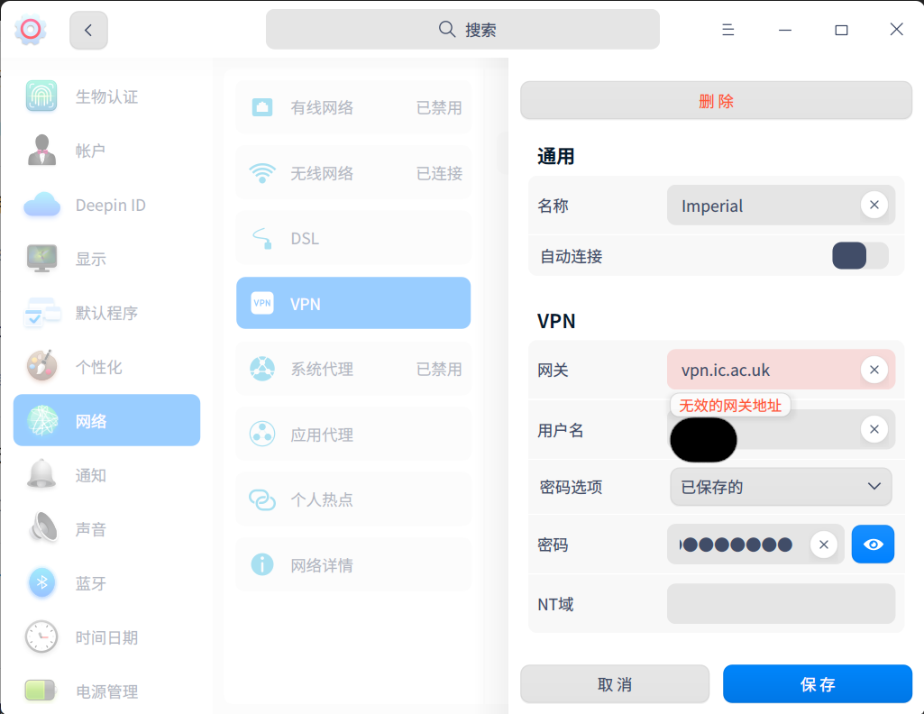 2022-04-29 05:17 网关那里输入域名不让保存确实不方便,现在临时解决是在网关那里输入它的IP,保存好后导出配置文件,然后将连接删除,编辑导出的配置文件,将remote后面的IP地址改为域名形式的,保存退出。