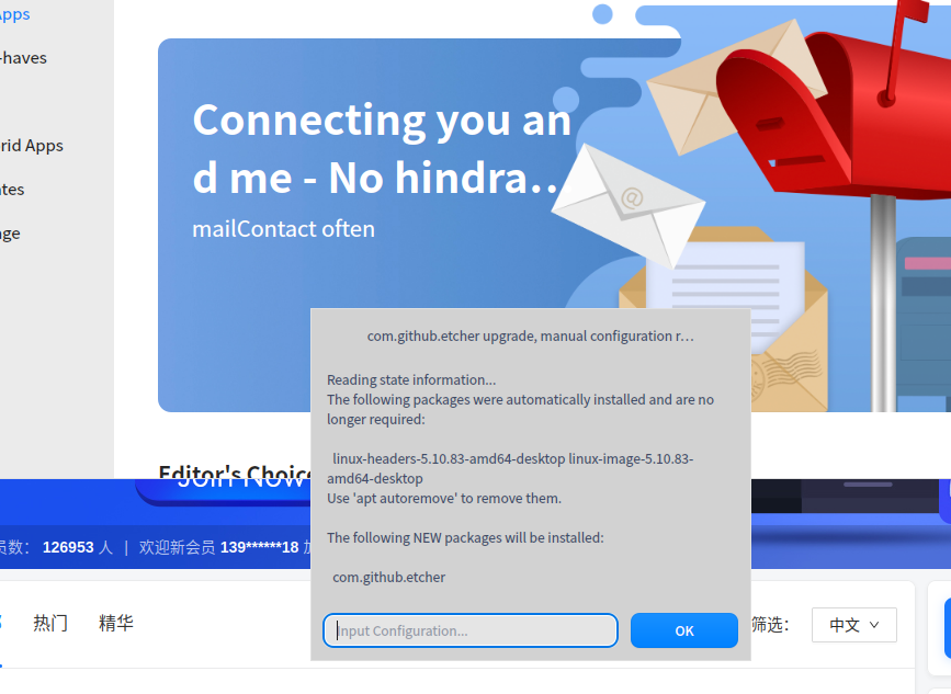 2022-05-16 01:06 无法复现这个问题,Deepin 20.5 上安装 etcher 直接可以成功,这个软件包没有额外的依赖。