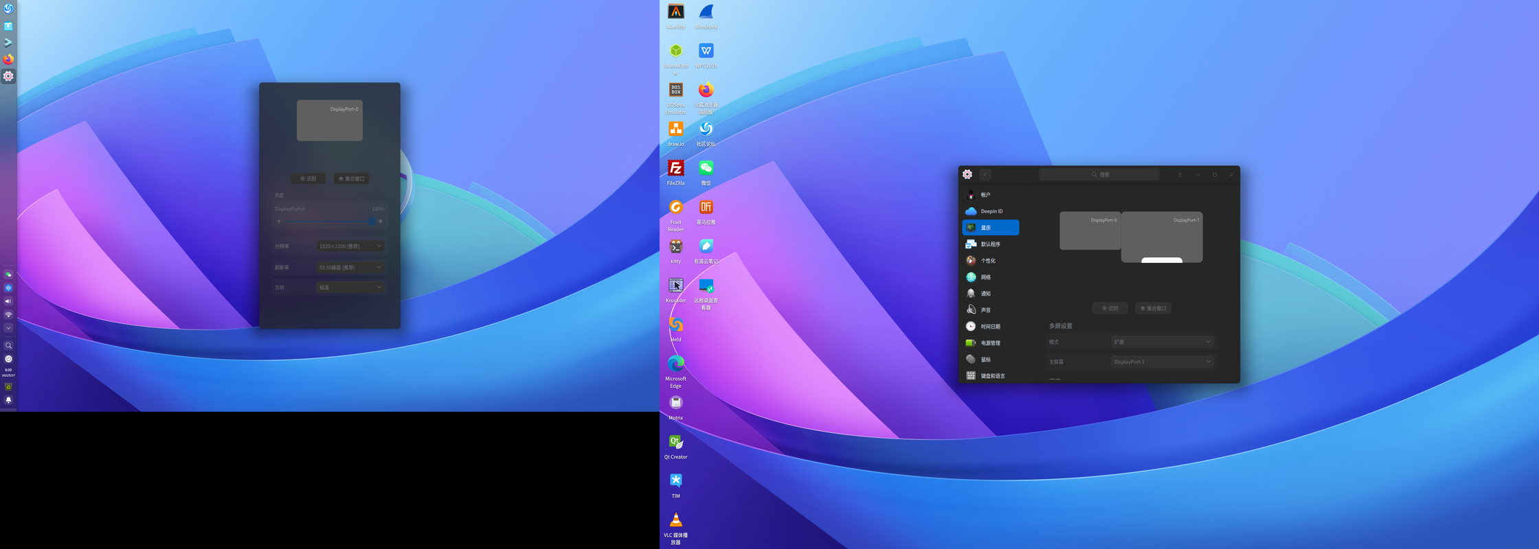 按照这个帖子https://bbs.deepin.org/post/202404的方法设置之后,任务栏的位置问题解决了,但是主副屏的相互关系还是有点不对,鼠标要移动到副屏是从主屏左侧移动过去的,而不是从主屏右侧移动过去,感觉桌面还是认为DisplayPort-0是主屏,而不是设置的DisplayPort-1为主屏。