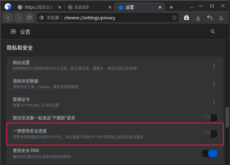 去浏览器设置中的隐私和安全看了一下,一律使用安全连接这个选项一直是关着的。