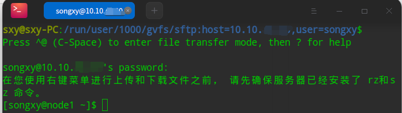 直接在文件管理器连接到服务器之后,进入某个目录右键在终端打开是如上所示的界面,最前面显示还是本地PC的标志,这个应该是sftp访问。