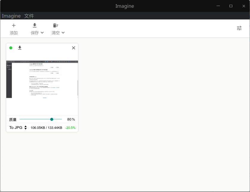 这款Imagine图像压缩工具支持常见的jpg和png图片格式,UI也很简单明了,还支持win、mac、linux三大平台,对压缩质量要求不高的可以试试