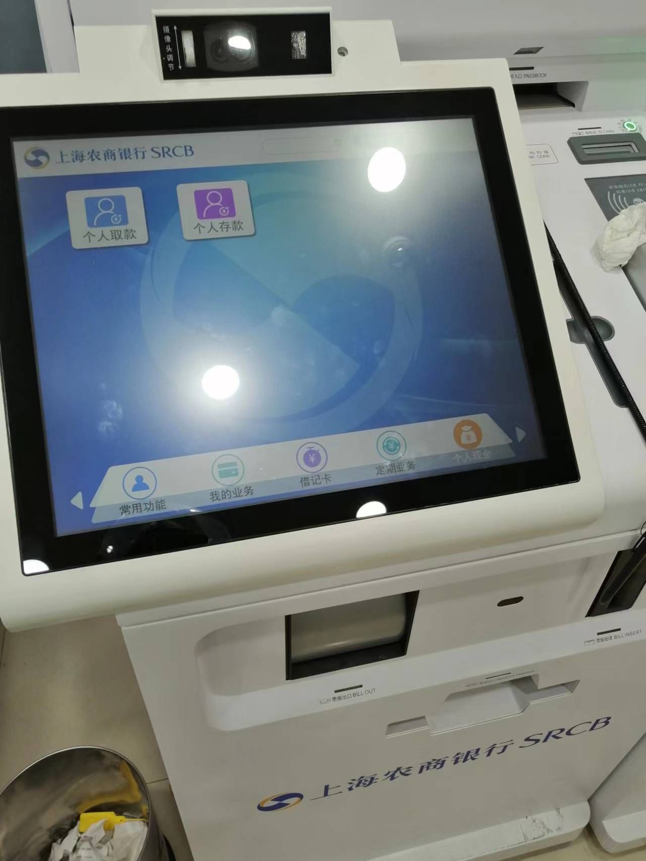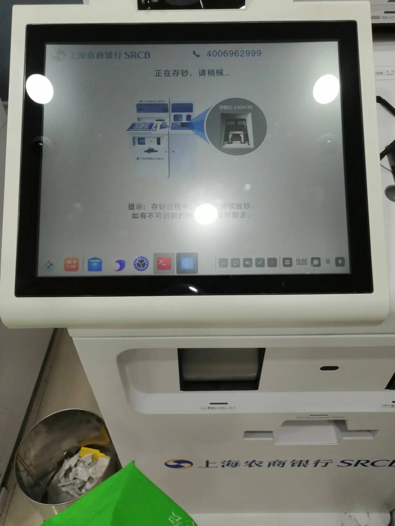 不敢点,现在是工作人员问你办什么业务,然后把取号纸和身份证给他检查,然后他来操作屏幕,你只负责放钞和取钞,不让你碰屏幕。