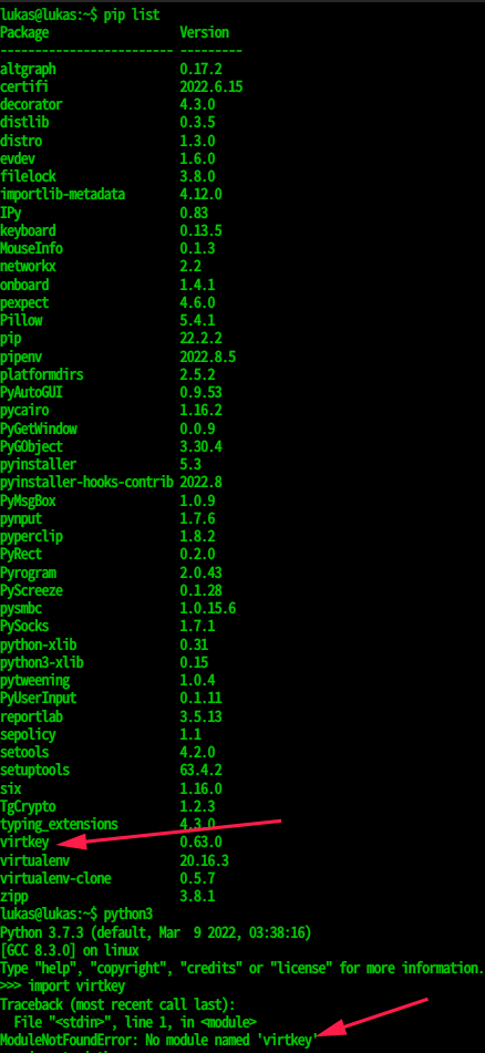 朋友们,我费了好大的劲,总算能够正常使用virtkey这个库了。这个库的优点是可以模拟输入unicode中的特殊字符,其他的库通常只能输入键盘字符。原本是ubuntu的库,其他发行版上面似乎没多少人用,在ubuntu可以直接命令行sudo apt install python3-virtkey安装,但是其他发行版需要用源代码。
