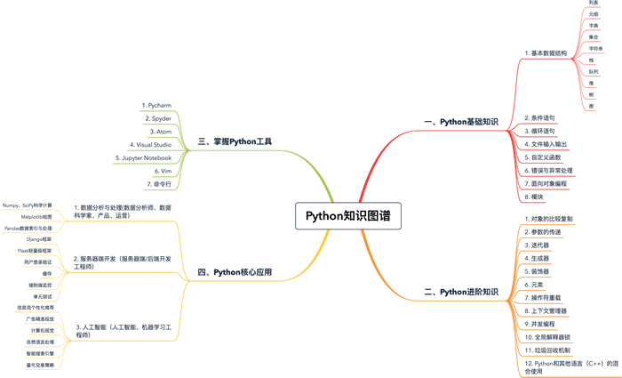 本教程中无法让你完成一个上亿用户级产品的实践,但设置有一些小项目,可以帮你掌握必要的开发知识。最后,这里为你准备了一张 Python 学习的知识图谱,涵盖了 Python 的核心知识,其中的大部分内容本教程都会做详细讲解。