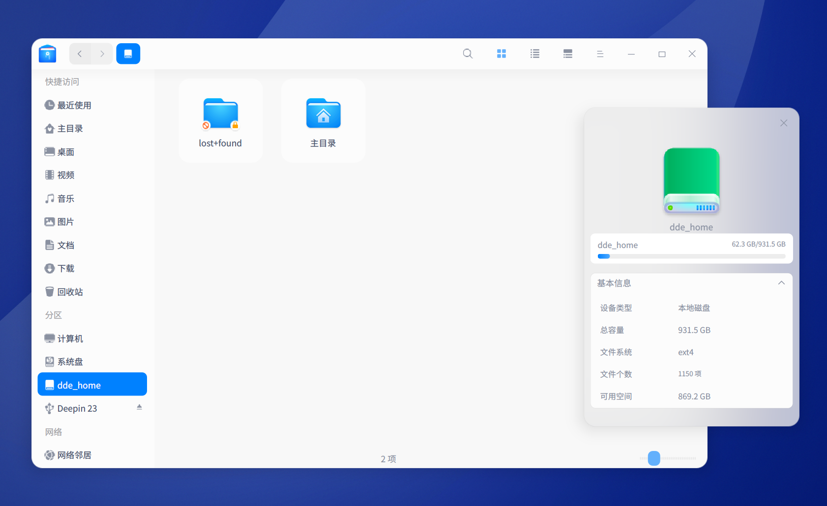进入系统后我彻底蒙蔽了,我的/home下面的数据全部不见了,包括(桌面,下载,文档)这些home下的所有目录的数据都没了。然后我查看dde_home却发现他占用了62.3G的空间。所以我猜测我的文件数据应该是还在的,不然不可能占用这么大打空间。