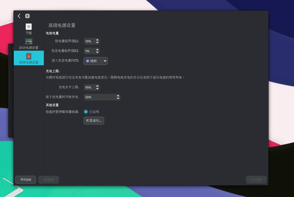 前天看到Nitrux OS新出了2.8的版本,一时手痒装了一个试试,意外发现电源管理选项里居然可以设置充电阈值,这个功能老款的Thinkpad一直有,对笔记本电池的使用寿命实在是太友好了。不知道我们的深度系统能不能考虑下把这个功能加进去?