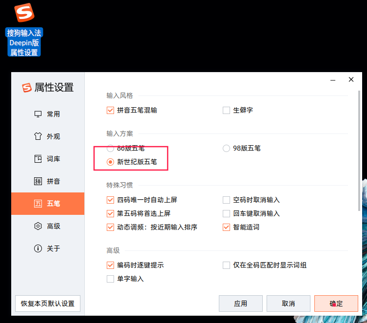 安装了最新的V23版,但发现没有五笔输入法,安装了五笔拼音,却发现是86版本的,真希望同时能提供一个98版的啊,现在百度五笔输入法都提供86版,98版双选项,我电脑没有安装百度输入法,但手机版有安装,都一样的.让用户自主选择,但deepin只提供了86版,只能自己折腾了.