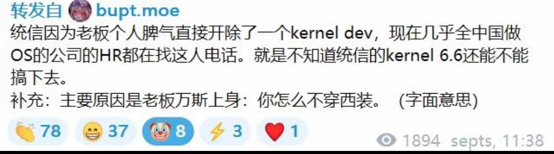 UOS领导官威确实牛逼👍,工程师年会没钱买西装,竟然直接开除系统内核研发人员,成功让领导自己成为系统的内核。 我就想问:UOS系统,以后的bug是不是也是领导自己能修复?