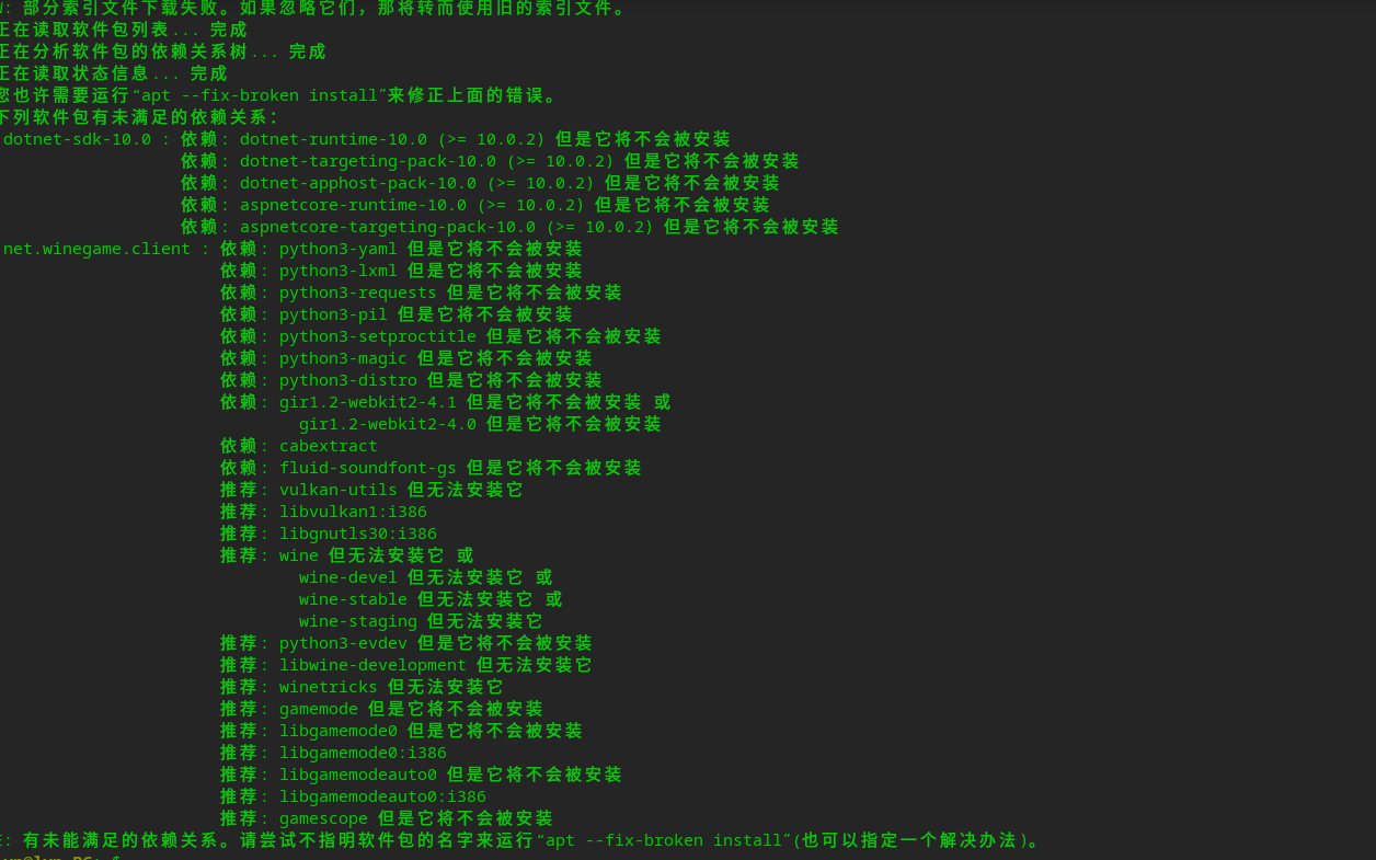 开发环境啊,还以为你是要用win软件……开发环境建议还是用JetBrains Rider或VS,apt仓库里的依赖不全,或者从微软官网下.tar.gz包,可能还得配置环境变量之类的。