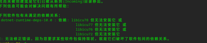 https://dotnet.microsoft.com/zh-cn/download/dotnet/10.0 下载二进制版本 然后在/etc/profile里配置环境变量吧 deb版的dotnet10依赖不满足