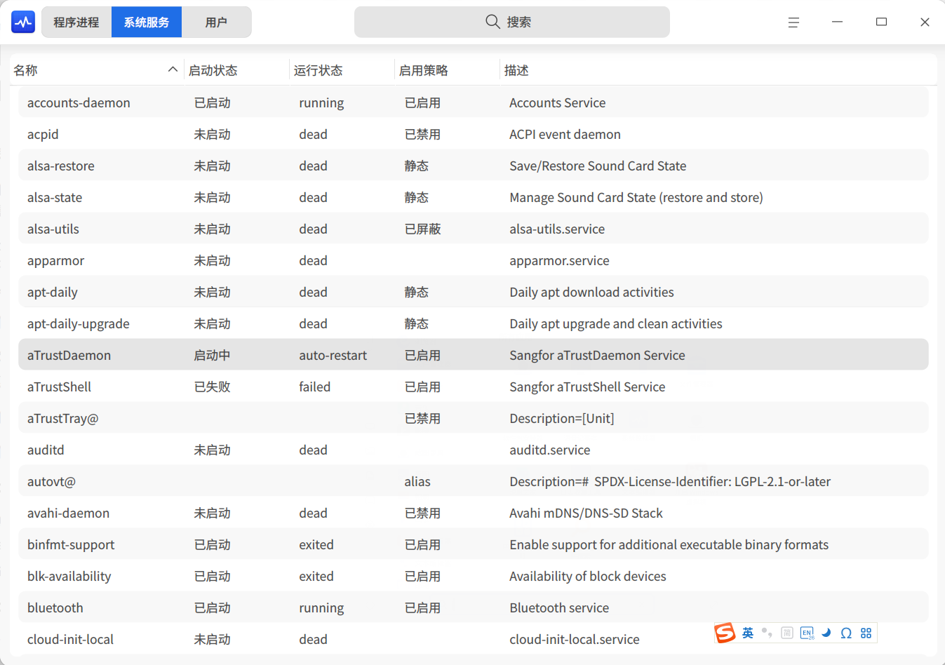 3. 在系统服务里看到 atrustdaemon 是启动中,atrustshell 启动状态是已失败 atrustTray@ 已禁用