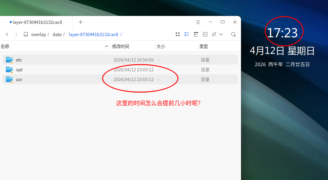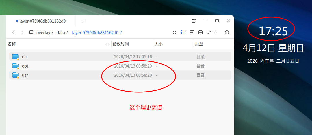 2026-04-13 00:58:20(比当前时间提前约 6 小时 57 分)2026-04-13 00:58:20.512430661 +0800(带 + 0800,说明时区标记正确)2026-04-12 16:59:00(早于当前时间,正常)这个 overlay目录是Deepin 25 系统的 overlayFS 联合文件系统层,用于系统更新、容器 / 沙箱环境或只读根文件系统的写时复制(CoW)。