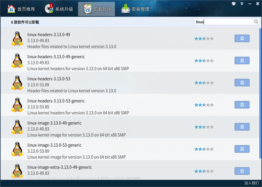 在深度商店卸载的地方,可以搜索“Linux”,他们都是旧内核,如果你当前内核没问题,可以选择删除它们,这样开机就没上面说的选项了
