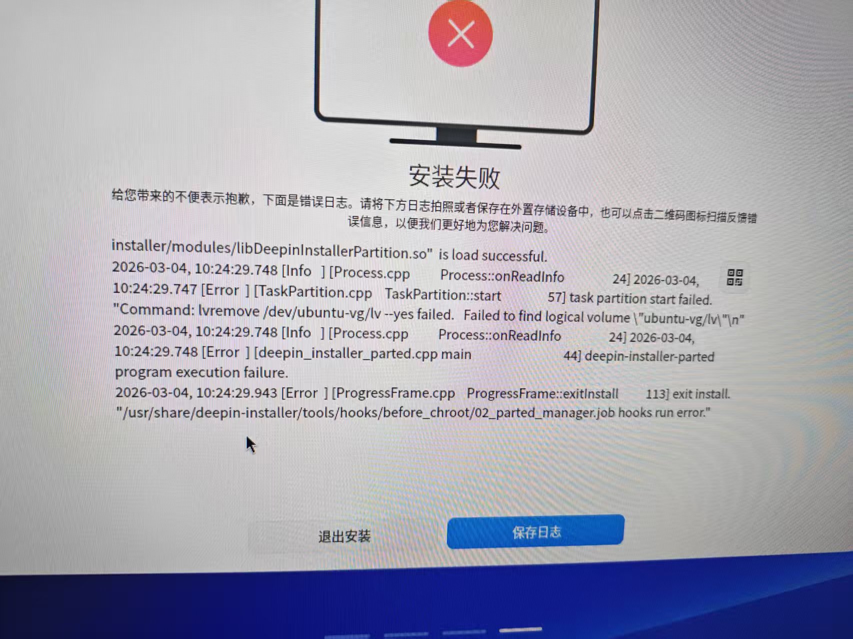 2026-03-04, 02:57:05.571 [Error ] [ProgressFrame.cpp ProgressFrame::exitInstall 113] exit install. "/usr/share/deepin-installer/tools/hooks/before_chroot/02_parted_manager.job hooks run error."